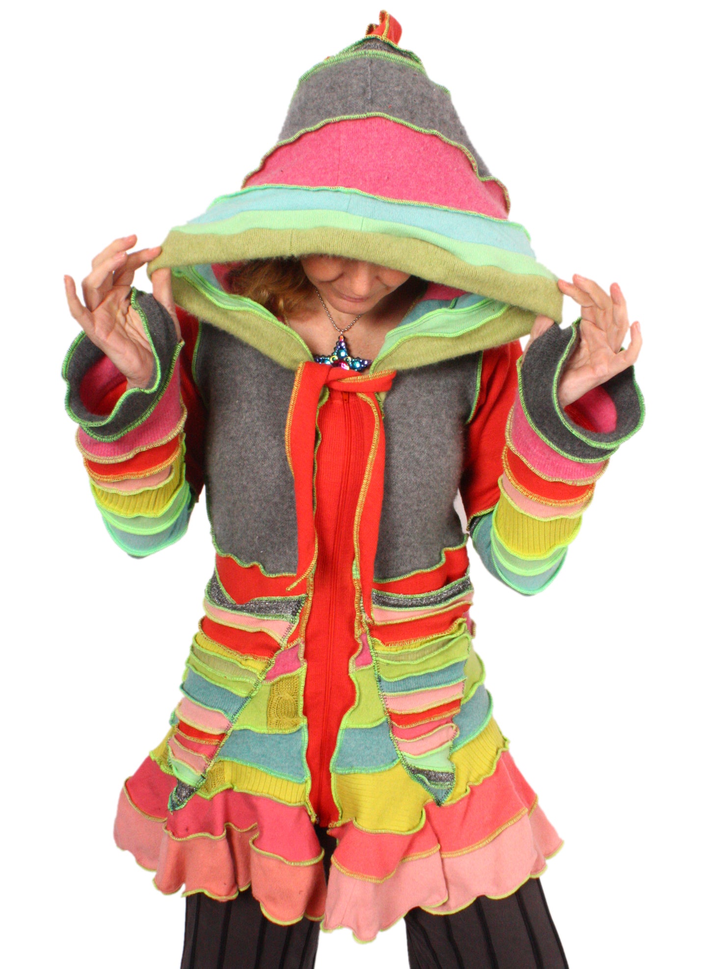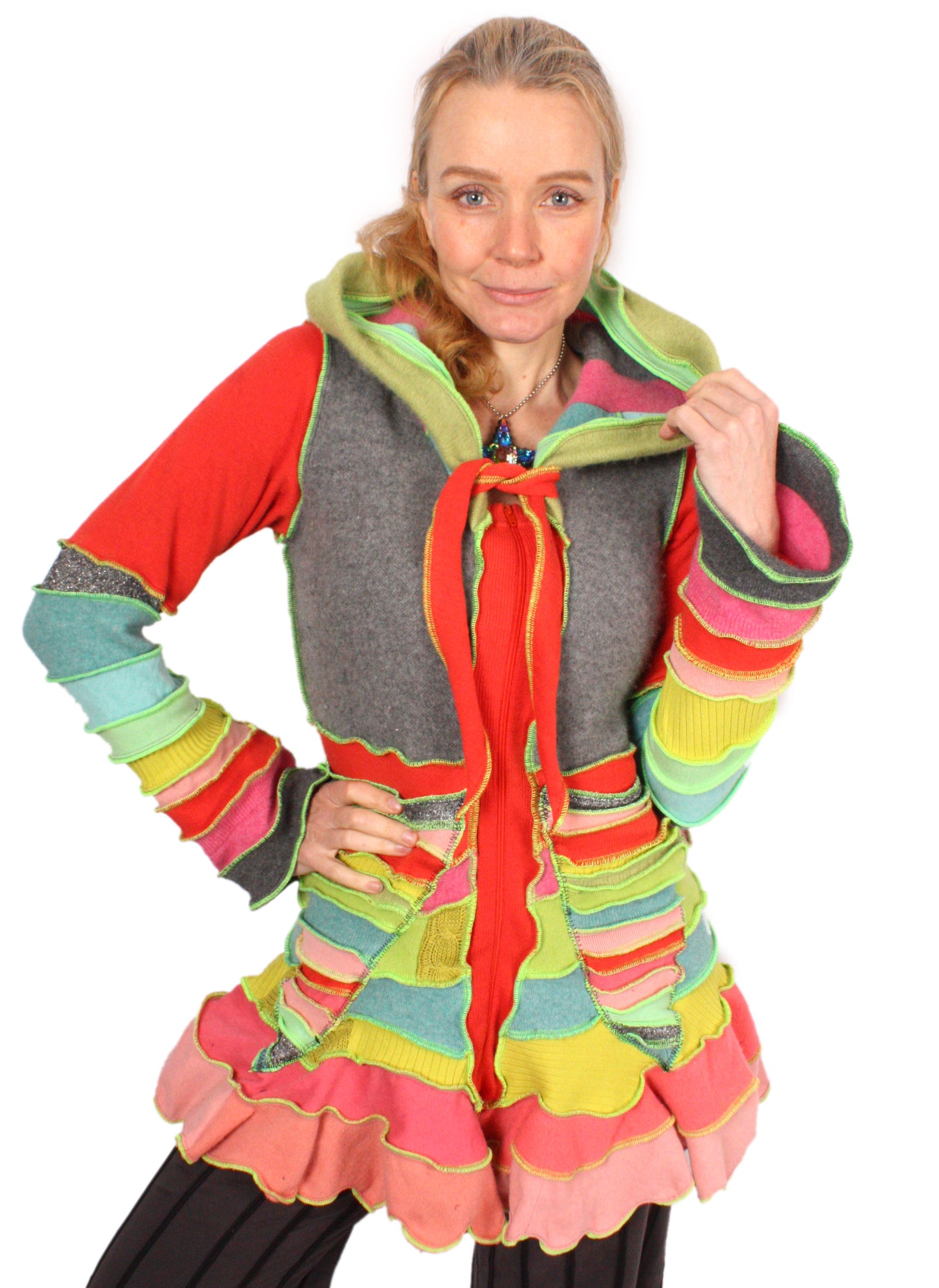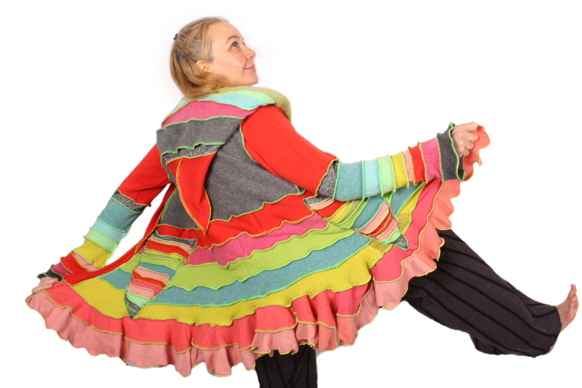 Flouncy Coats are fun and twirly with lots of bouncy ruffles. I use lots of lightweight soft stretchy knits that make these very comfy and easy to wear, while still being extravagantly cheerful.
