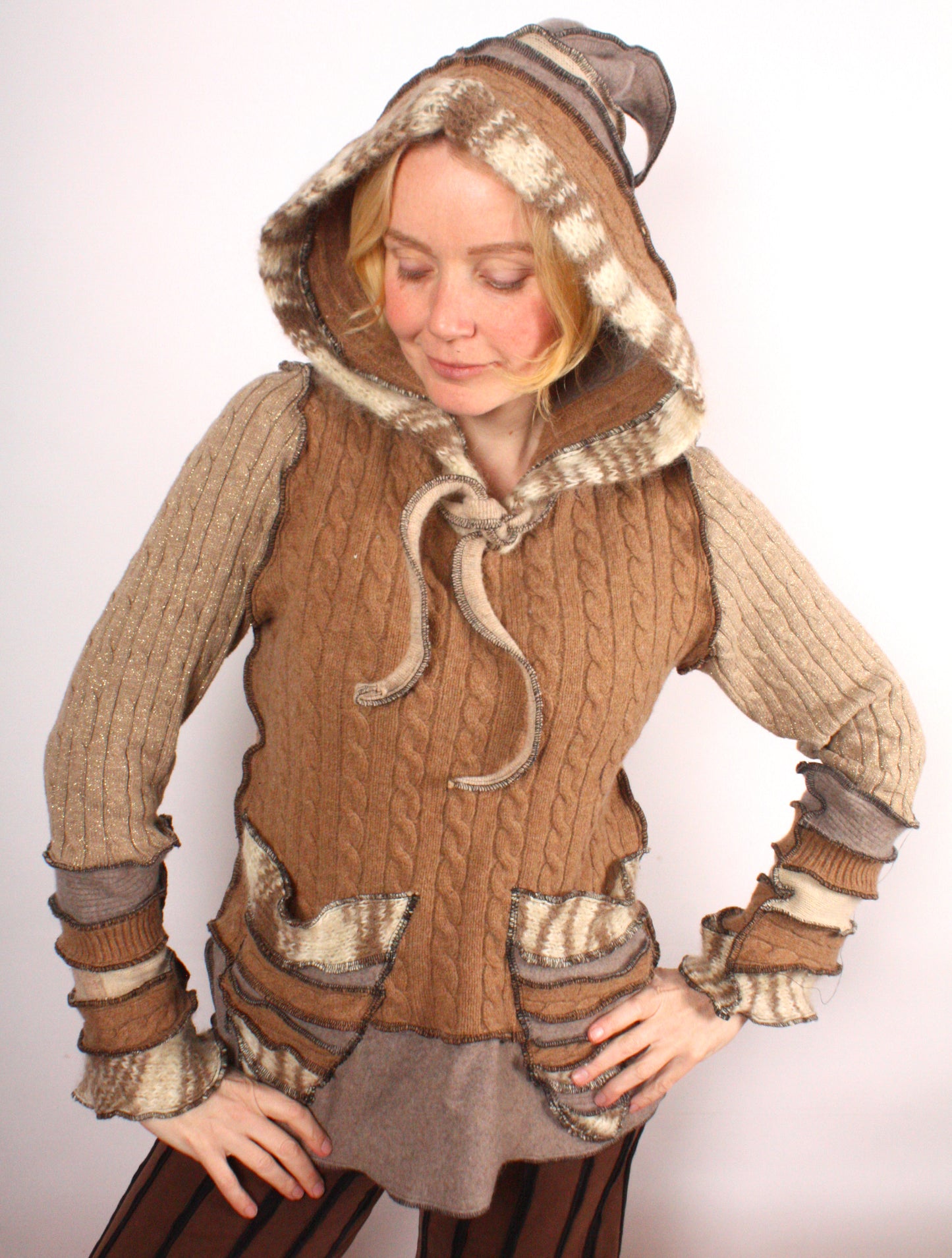 Each Katwise sweater is one-of-a-kind, sewn by me in my attic. They are perfectly imperfect, sometimes borderline wonky. They are all upcycled from sweaters I find in my vast thrift shopping expeditions. There is a huge variety in the texture and stretchiness of these knits, so no two are ever quite alike.