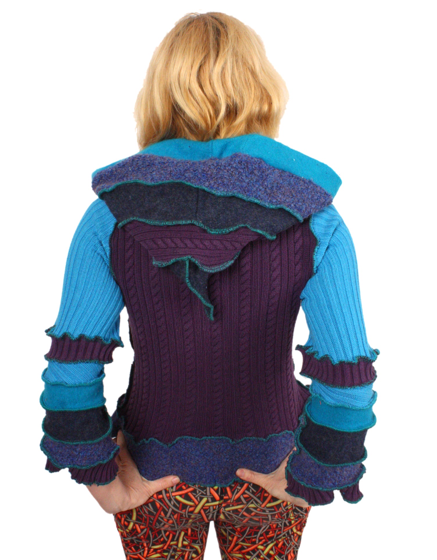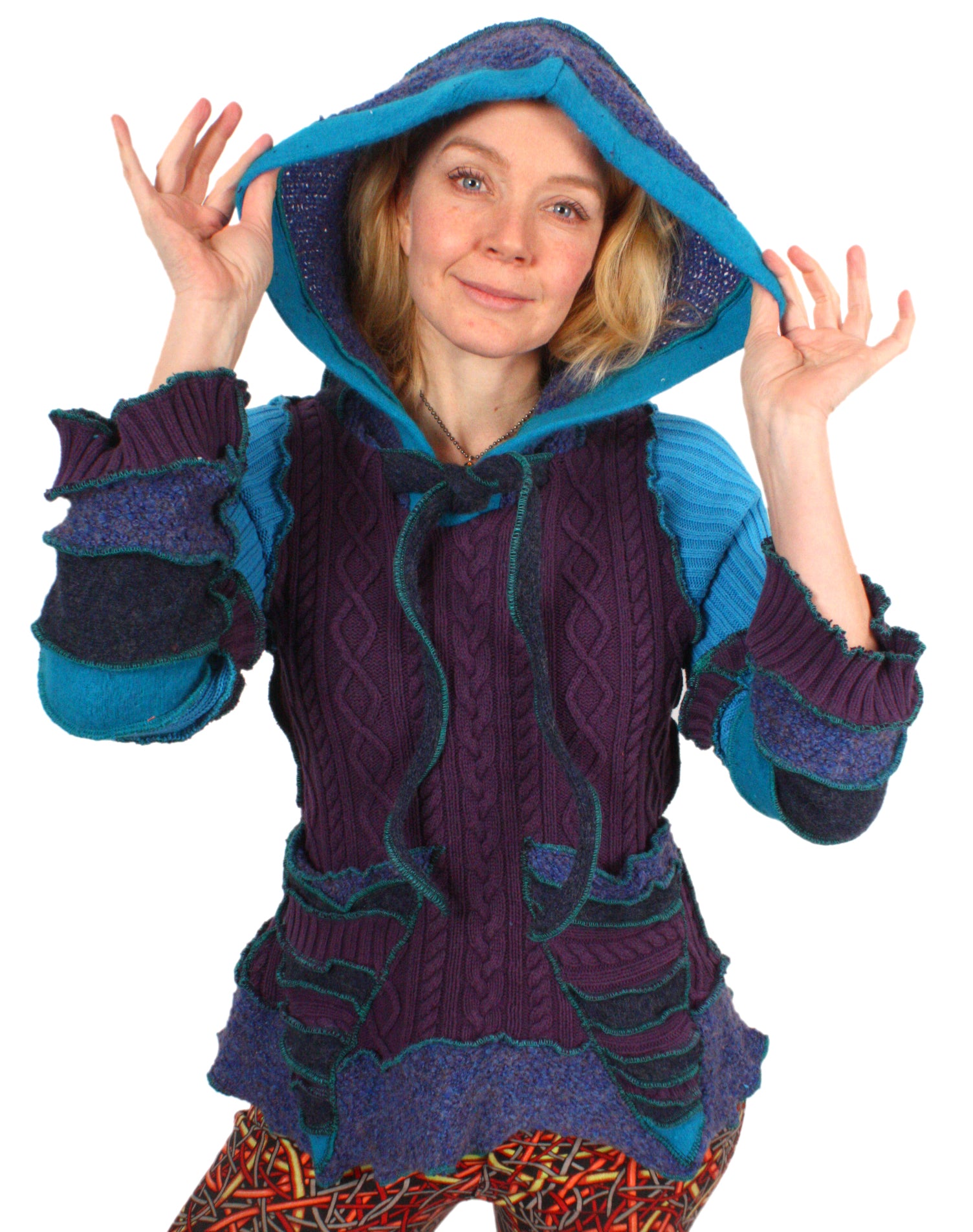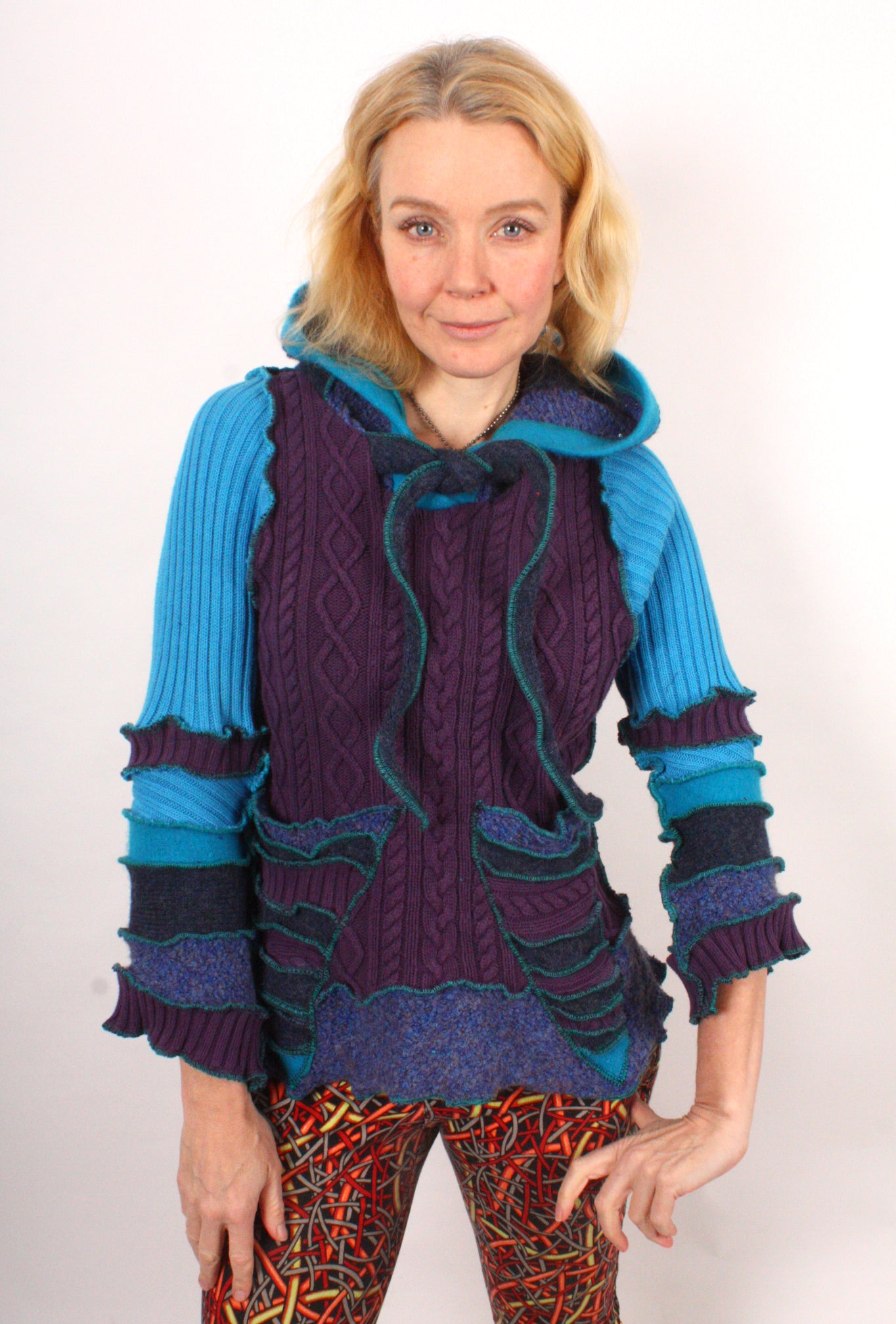 Each Katwise sweater is one-of-a-kind, sewn by me in my attic. They are perfectly imperfect, sometimes borderline wonky. They are all upcycled from sweaters I find in my vast thrift shopping expeditions. There is a huge variety in the texture and stretchiness of these knits, so no two are ever quite alike.
