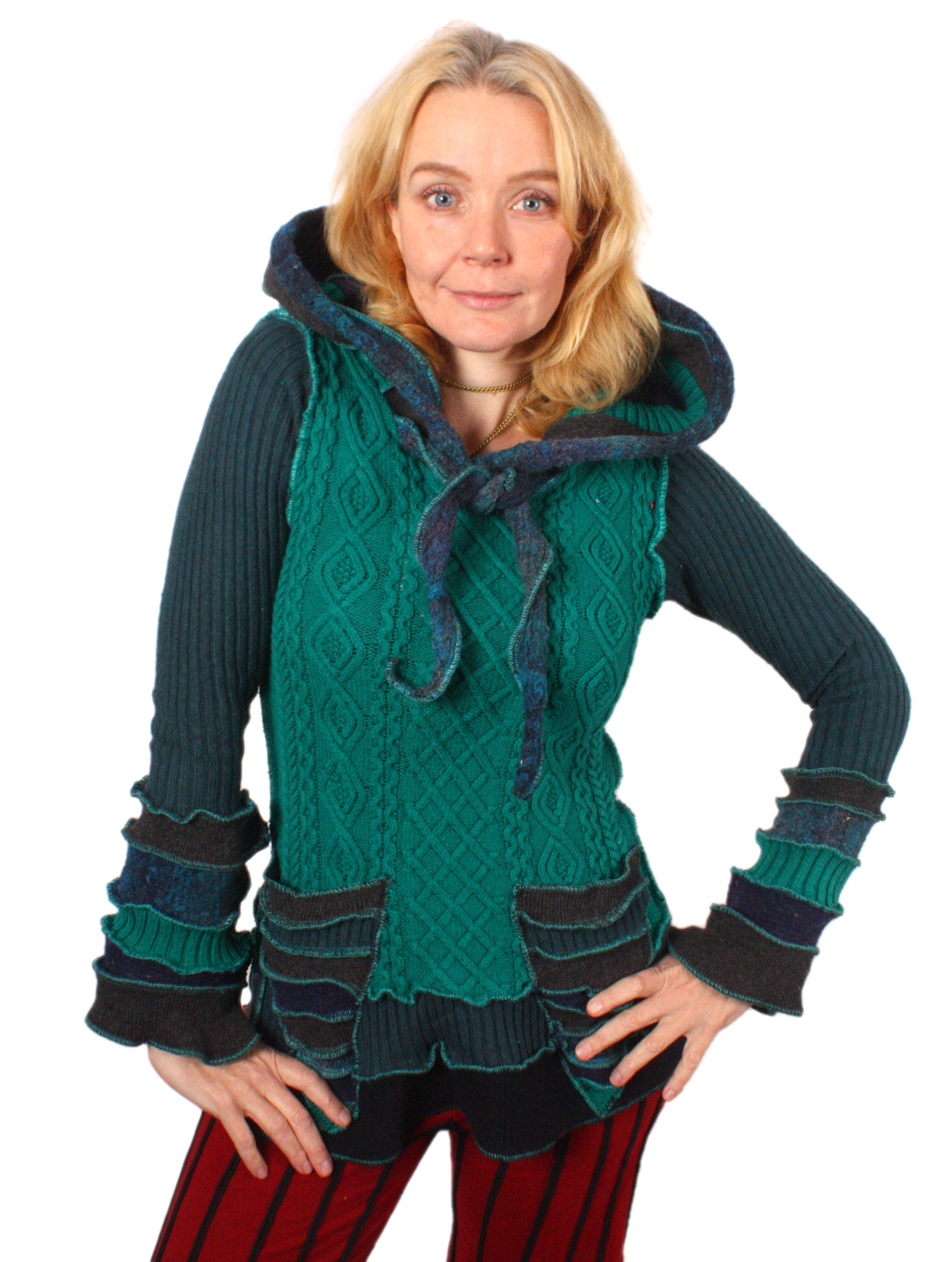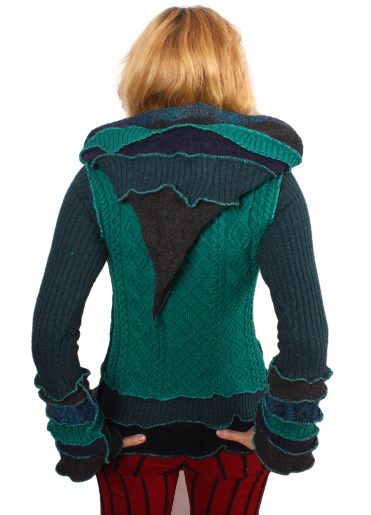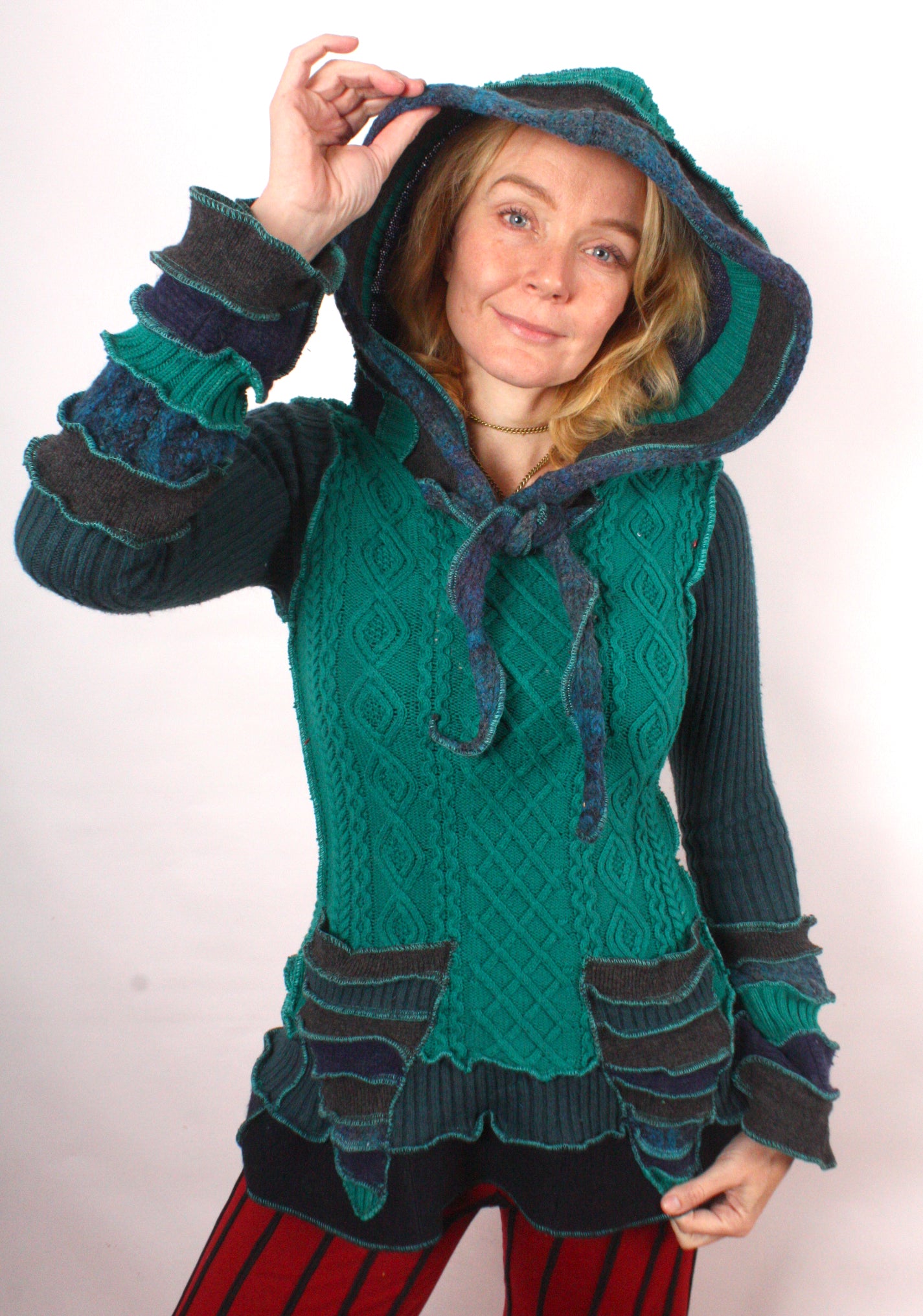 Each Katwise sweater is one-of-a-kind, sewn by me in my attic. They are perfectly imperfect, sometimes borderline wonky. They are all upcycled from sweaters I find in my vast thrift shopping expeditions. There is a huge variety in the texture and stretchiness of these knits, so no two are ever quite alike.