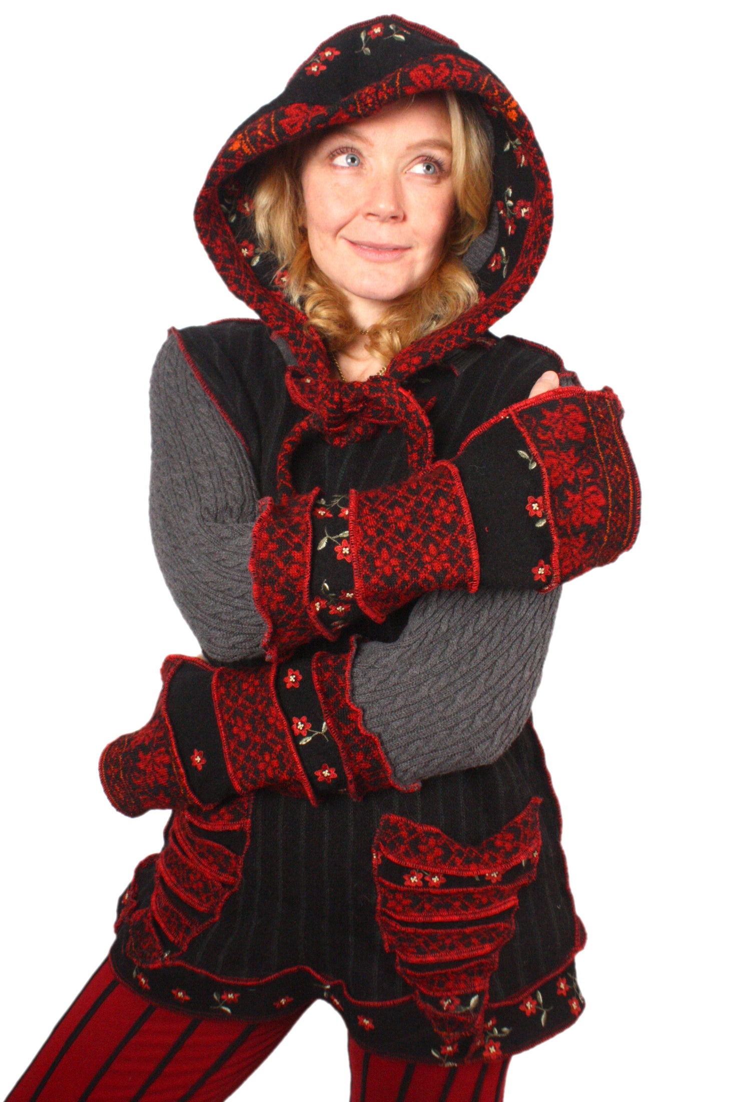 Each Katwise sweater is one-of-a-kind, sewn by me in my attic. They are perfectly imperfect, sometimes borderline wonky. They are all upcycled from sweaters I find in my vast thrift shopping expeditions. There is a huge variety in the texture and stretchiness of these knits, so no two are ever quite alike.