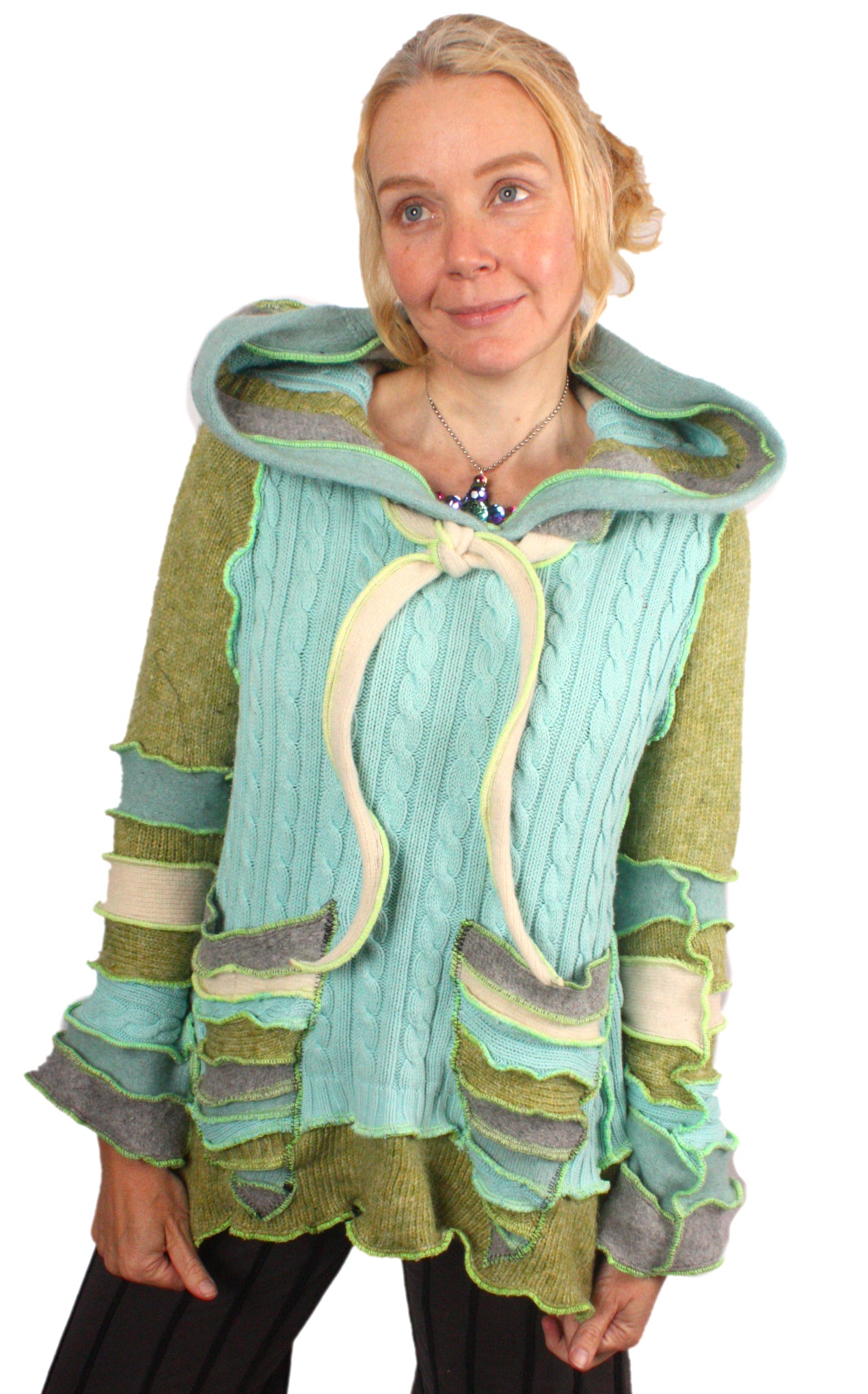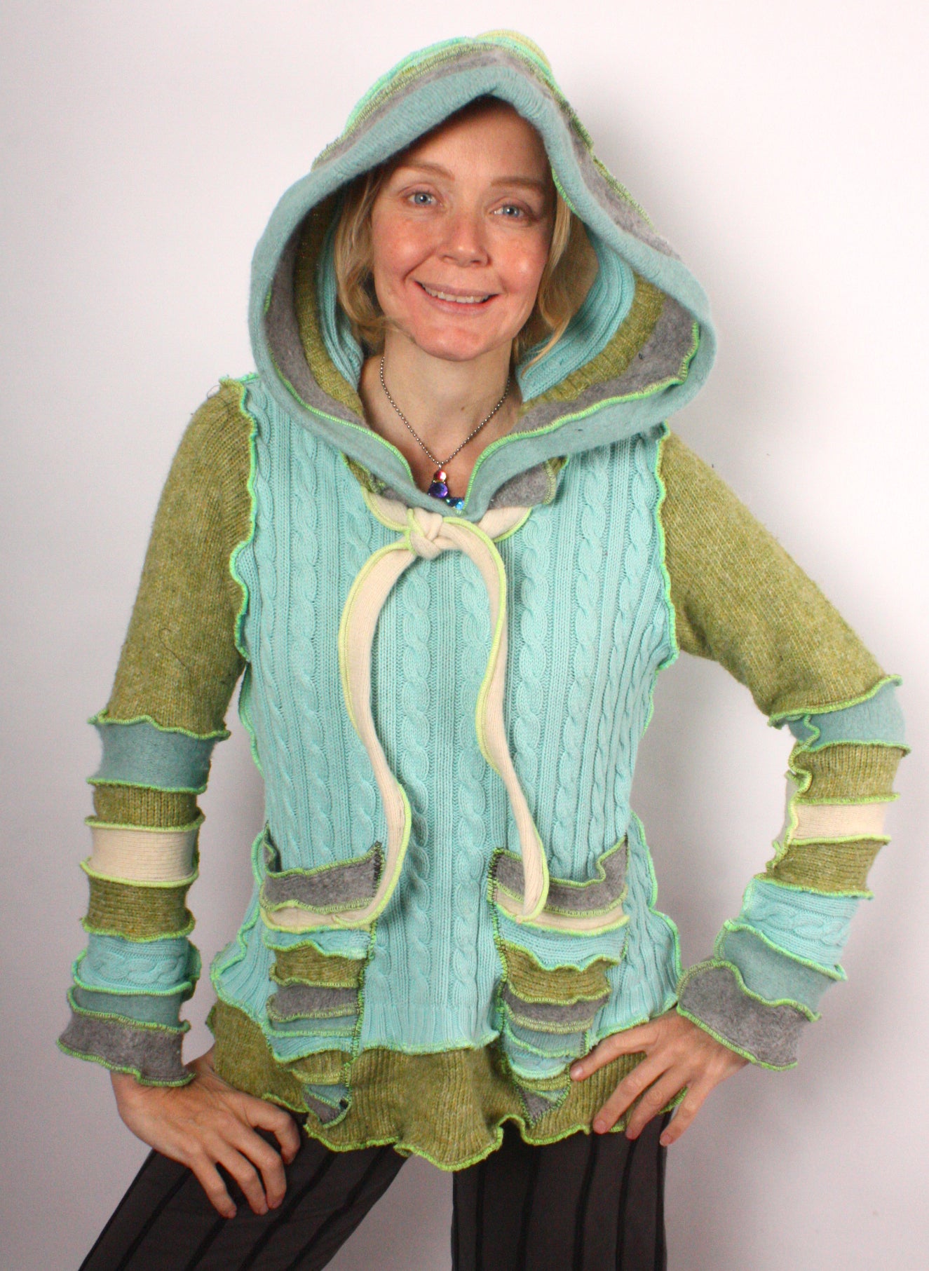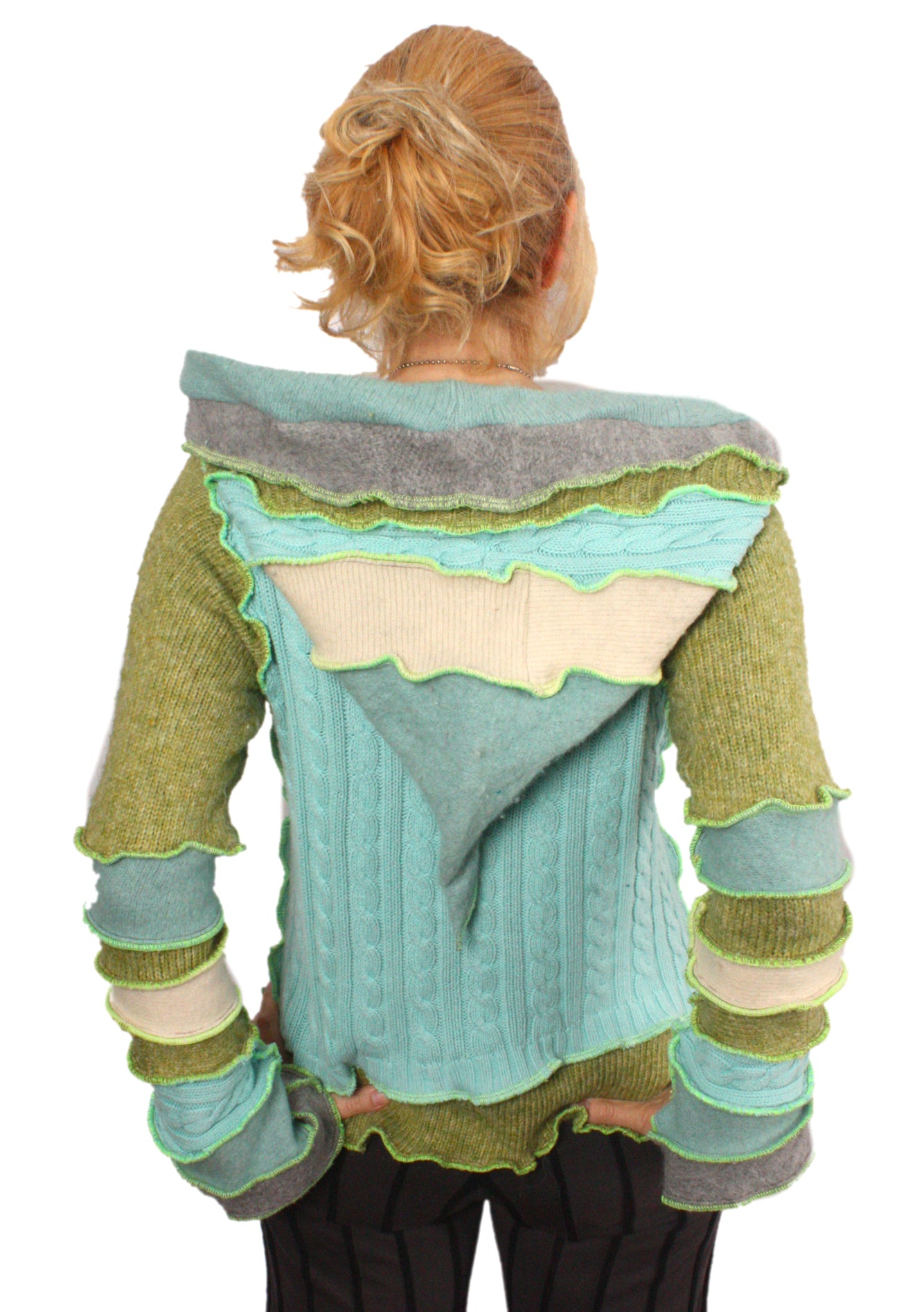 Each Katwise sweater is one-of-a-kind, sewn by me in my attic. They are perfectly imperfect, sometimes borderline wonky. They are all upcycled from sweaters I find in my vast thrift shopping expeditions. There is a huge variety in the texture and stretchiness of these knits, so no two are ever quite alike.